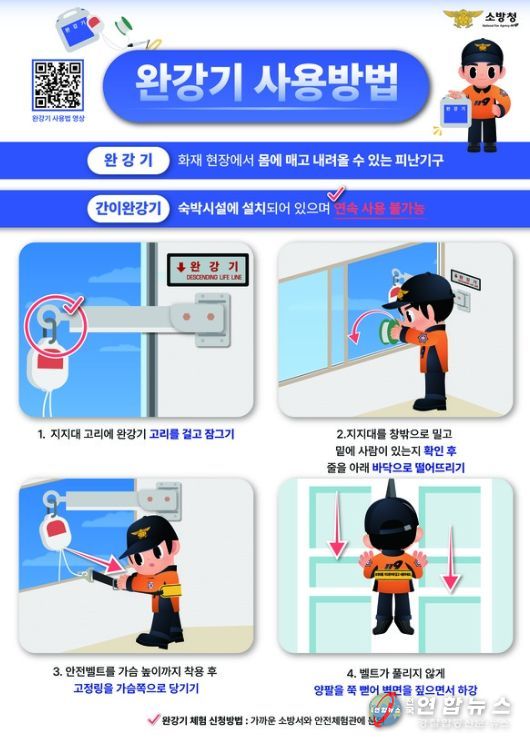 소방서 관계자는 “지지대 고리에 완강기를 걸고, 안전벨트를 착용한 뒤 벽면을 짚으며 천천히 하강해야 한다”며 “완강기는 화재로 인한 인명피해를 줄일 수 있는 중요한 피난기구”라고 강조했다.