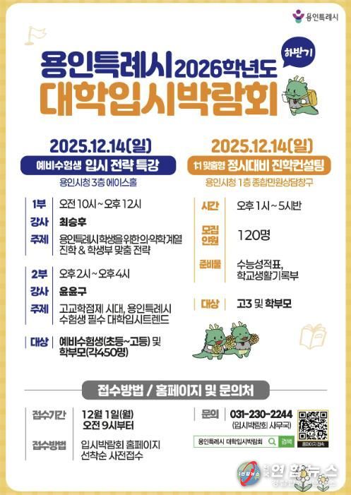 전국연합뉴스 박남호 기자 | 용인특례시는 12월 1일 오전 10시부터 오후 5시 30분까지 시청 에이스홀과 종합민원상담창구에서 ‘하반기 2026학년도 대학입시박람회’를 연다고 25일 밝혔다.