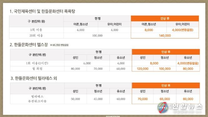 국민체육센터와 한들문화센터 내 목욕탕 1회 이용요금은 2,000원, 20회 이용요금은 4만 원 인상된다.