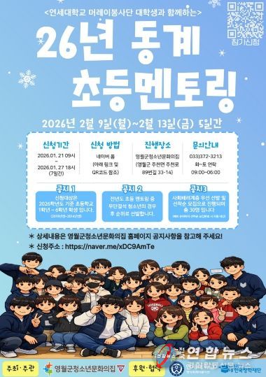 전국연합뉴스 기자 | 영월군청소년문화의집은 오는 2월 9일부터 13일까지 5일간 영월 관내 초등학생을 대상으로 ‘2026년 동계 초등멘토링 프로그램’을 운영한다고 밝혔다.