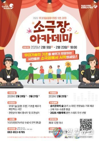교육은 오는 28일부터 3월 21일까지 인화동에 있는 '익산솜리문화의 숲-솜리소극장'에서 매주 토·일요일 오전 9시부터 오후 4시까지 운영된다.