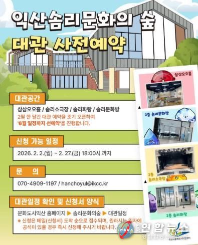 전국연합뉴스 최성용 기자 | 익산시가 시민과 지역 단체의 문화 활동을 지원하기 위해 '솜리문화의 숲' 대관 접수를 확대 운영한다.