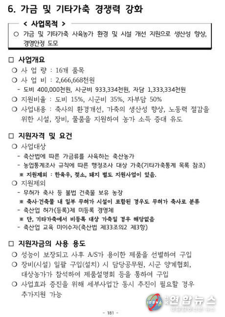 ‘가금 및 기타가축 사육농가 지원사업’은 시설 현대화를 통한 축사 환경 개선, 방역 물품 지원 등을 통한 생산성 향상이 주요 내용이다.