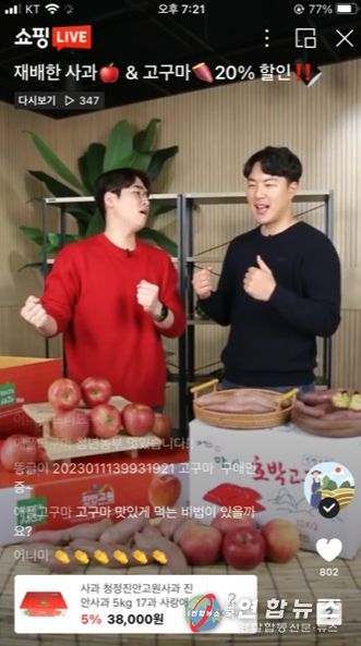 평소 4만원대에 판매 중인 사과(부사)를 라이브특가 20% 할인 적용가인 5kg 32,000원에 판매했으며, 꿀고구마 역시 10kg 24,000원으로 할인 판매했다. 이번 라이브커머스는 고심농장(고상기 대표)과 진안군에 지점을 둔 쇼셜미디어 마케팅 협동조합 누비온 소속의 전문 쇼호스트가 함께 진행했으며, 진안고원 사과와 고구마 품질의 우수성을 소개하고 간단한 레시피를 준비해 시식하는 순서로 진행했다.