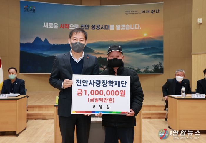 전국연합뉴스 관리자 기자 | 주천면 고영성씨가 12일 주천면사무소 강당에서 열린 연초방문에서 진안사랑장학재단에 장학금 100만원을 기탁했다.