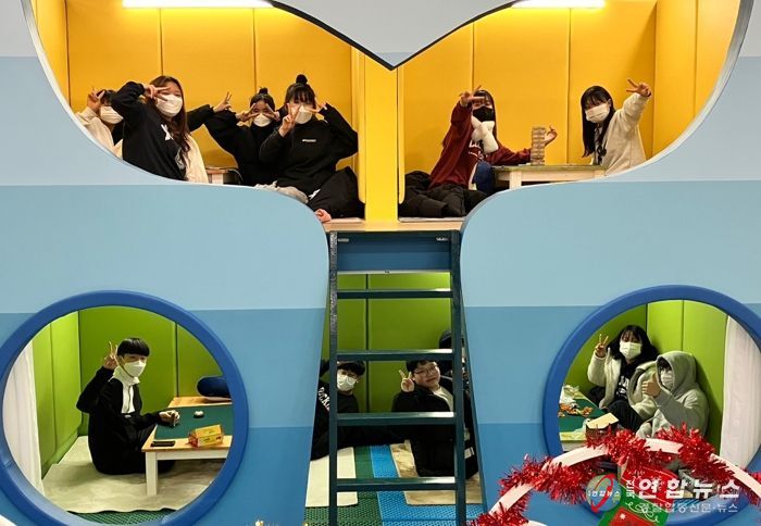 연푸른 색 바탕에 밝은 노랑과 연두색이 어울린 실내 분위기는 그야 말로 화난 감정도 풀어주는 ‘치유의 천국’을 연상케 했다. 마스크를 낀 학생들의 표정은 너무 밝았고, 검지와 장지 손가락으로 브이(V)자를 그리는 모습엔 만족감이 가득했다.