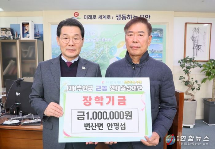 전국연합뉴스 관리자 기자 | 부안 변산면에서 동신떡방앗간을 운영하는 안명섭씨는 12일 부안군 근농인재육성재단을 방문하여 지역 인재육성을 위한 장학금 100만원을 기탁했다.
