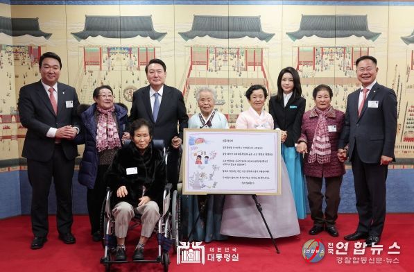 전국연합뉴스 관리자 기자 | 윤석열 대통령과 김건희 여사는 12일 오후 용산 대통령실에서 ‘칠곡할매글꼴’의 주인공인 김영분(77), 권안자(79), 이원순(86), 추유을(89), 이종희(91) 할머니를 만났다.