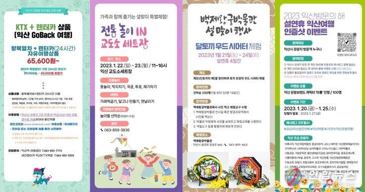 시 관계자는 “명절연휴를 활용하여 아름다운 익산의 관광지를 찾는다면 후회없는 설날 여행이 될 것”이라며 “특히 숙박여행객을 위해 농촌체험마을은 체험프로그램과 쾌적한 숙박시설을 함께 이용할 수 있어, 어린이들을 위한 여행프로그램으로 강력 추천한다”고 전했다.