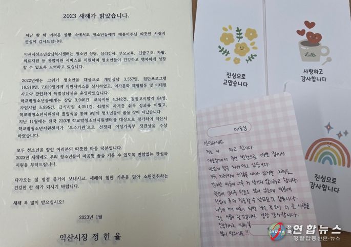 전국연합뉴스 관리자 기자 | 익산시청소년상담복지센터는 17일 지난 한 해동안 청소년에게 도움을 준 30명의 후원자들에게 감사 서한문을 발송했다.