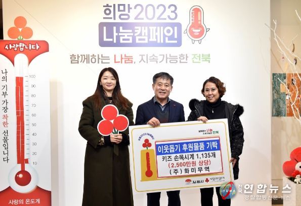 전국연합뉴스 관리자 기자 | 1월 17일 서울특별시 성동구에 위치한 ㈜화미무역(대표이사 이라원)에서 관내 사회 복지시설에 전달해 달라며 김제시에 겨울왕국2 키즈 손목시계 1,135개(2,500만원 상당)를 기부함으로써 어려운 이웃에게 사랑을 전하는 '희망2023 나눔캠페인'에 동참했다.
