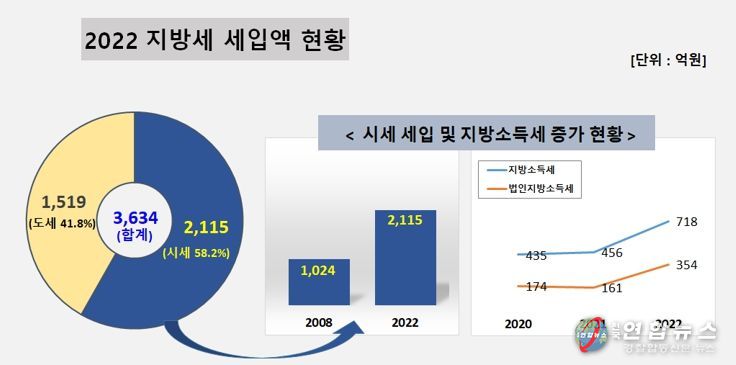 도세(道稅)를 포함하면 지방세 수입액은 3,634억 원(시세 2,115억 원, 도세 1,519억 원)이며 이 또한 역대 최대금액이다.