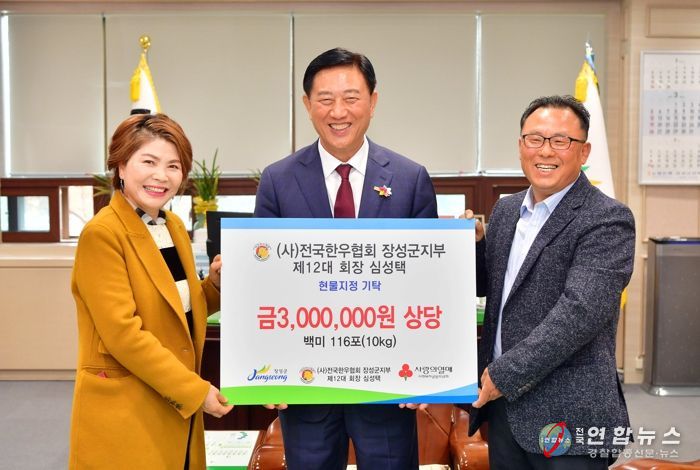 전국연합뉴스 김철환 기자 | (사)전국한우협회 장성군지부가 24일 쌀 116포(300만 원 상당)를 어려운 이웃을 위해 군에 기탁했다.