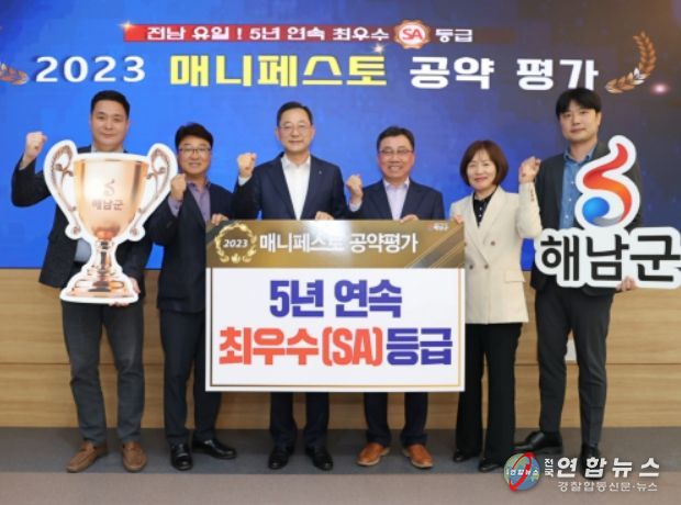 전국연합뉴스 김철환 기자 | 해남군이 한국매니페스토실천본부가 주관하는 2023 민선8기 전국 기초단체장 공약실천계획 평가에서 5년 연속 최고 등급인 최우수(SA)를 획득했다.