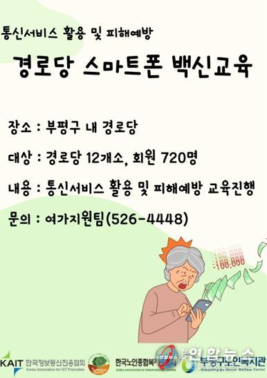 전국연합뉴스 김광원 기자 | 부평구노인복지관는 디지털 정보화시대에 발맞춰 통신서비스 활용 및 피해예방에 대한 ‘스마트폰 백신 교육’을 부평구 경로당 12개소 어르신 720명을 대상으로 실시한다고 밝혔다.
