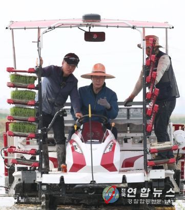 이앙기를 탄 정 시장은 골드 퀸 3호 품종 ‘수향미’모내기를 선보였다.