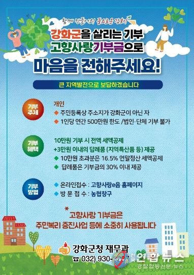 군 관계자는 "강화군에 소중한 마음을 보내준 기부자들에게 강화의 특색을 담은 다양한 답례품을 제공하기 위해 역량 있는 지역 업체들의 많은 관심과 참여를 바란다”고 말했다.
