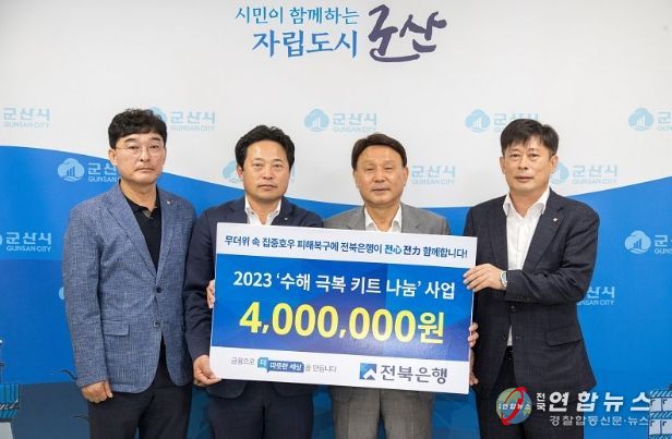 전국연합뉴스 최성용 기자 | 군산시는 25일 전북은행(은행장 백종일)이 이번 집중호우 피해를 지원하기 위해 400만원 상당의 쿨키트(쿨매트, 탁상요 선풍기, 쿨스카프 등) 100상자를 기탁했다고 밝혔다.