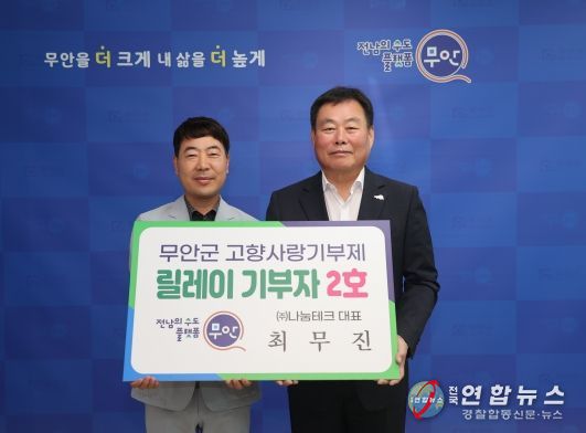 전국연합뉴스 김철환 기자 | 전남 무안군은 고향사랑기부제의 성공적 안착을 위해 추진하고 있는‘무안군 고향사랑기부 릴레이’에 ㈜나눔테크 최무진 대표가 두 번째 주자로 나서 훈훈한 마음을 계속 이어갔다고 1일 밝혔다.