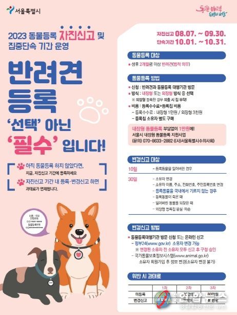 전국연합뉴스 김태연 기자 | 금천구는 8월 7일부터 9월 30일까지 반려견 등록 자진신고 기간을 운영하고 있다고 밝혔다.