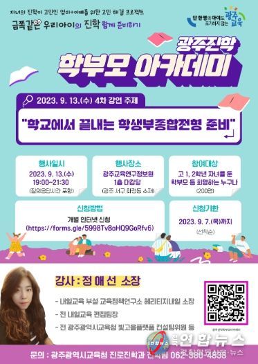 전국연합뉴스 김광원 기자 | 광주시교육청이 오는 13일 19시 ‘학교에서 끝내는 학생부종합전형’이라는 주제로 제4차 광주진학 학부모 아카데미 특강을 교육연구정보원 1층 대강당에서 개최한다.