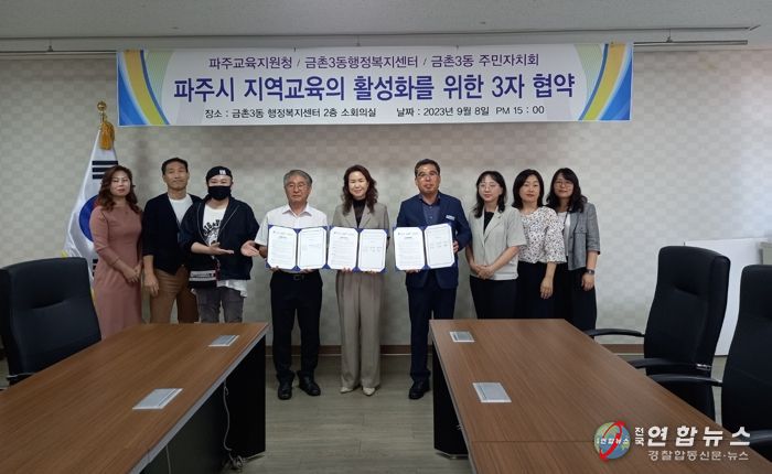전국연합뉴스 김광원 기자 | 파주교육지원청은 2023년 9월 8일 금촌3동 행정복지센터, 금촌3동 주민자치회와 학생주도활동 공간 활용을 위한 업무협약을 체결했다.