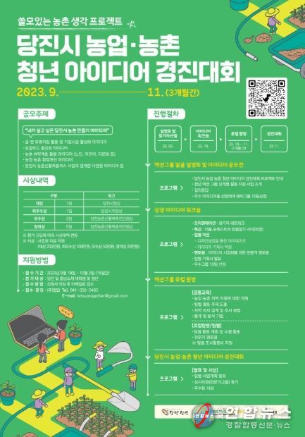전국연합뉴스 김용태 기자 | 당진시와 당진시농촌신활력플러스사업추진단에서 농촌에 활력을 불어넣기 위해 농업·농촌 청년 아이디어 경진대회를 진행한다.