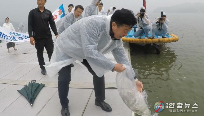 전국연합뉴스 김용태 기자 | 예산군은 예당호의 어족자원의 보호와 어업인의 소득증대를 위해 지난 20일 예당저수지 조정팀관리사무소 앞에서 토종붕어 47만마리를 방류했다.