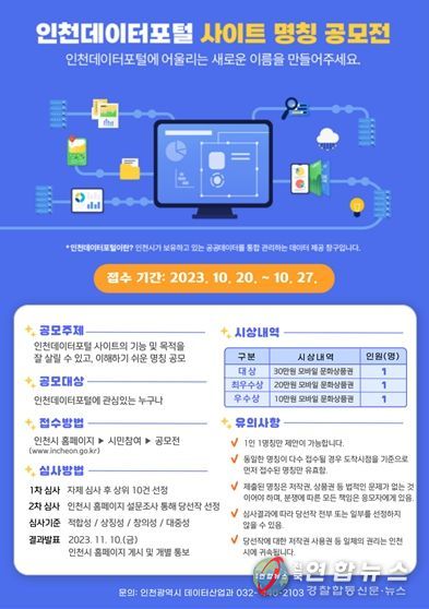 전국연합뉴스 김광원 기자 | 인천광역시는 오는 27일까지 ‘인천데이터포털 사이트 명칭을 공모한다고 밝혔다.