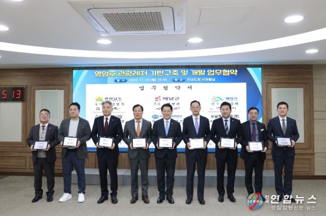 전국연합뉴스 김철환 기자 | 해남군은 20일 전라남도와 영암군, 한국농어촌공사, 목포대학교, 목포해양대학교, 서남해안기업도시개발(주), 서남해안레저(주), 엠씨 에너지(MC ENERGY)와 ‘영암호 관광레저 기반구축 및 개발’업무협약을 체결했다.