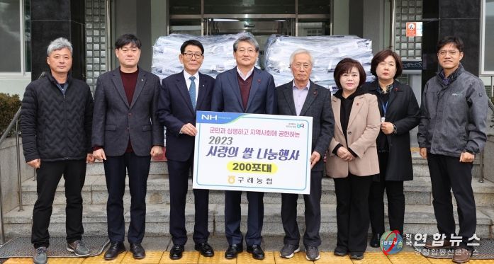 전국연합뉴스 김철환 기자 | 전남 구례군은 구례농업협동조합(노성원 조합장)에서 관내 어려운 이웃을 위해 이웃사랑 나눔 쌀 200포(560만 원 상당)를 기탁했다고 밝혔다.