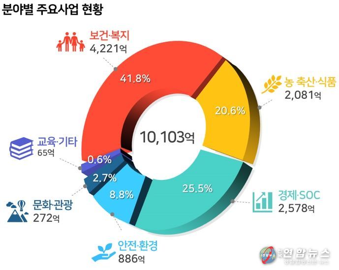 분야별로 보면 주민 삶과 밀접한 보건·복지 분야가 4,221억 원으로 가장 많다. 이어 △경제·사회기반시설 2,578억 원 △농축산·식품 2,081억 원 △안전·환경 886억 원 △문화·관광 272억 원 등 각 분야 핵심 현안 사업의 예산을 대거 확보해 지역경제에 활력을 불어넣게 됐다.