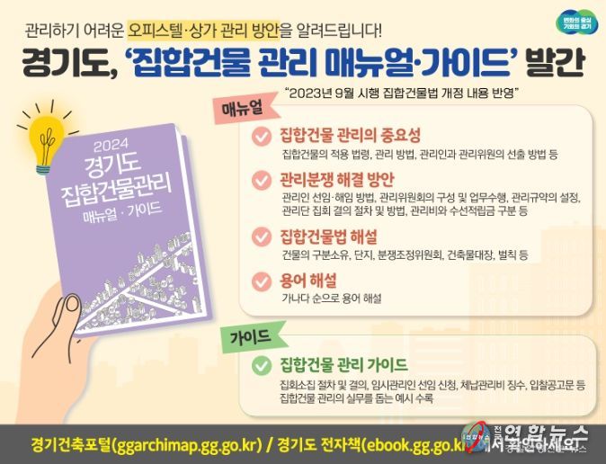 전국연합뉴스 조민준 기자 | 경기도는 오피스텔, 상가 등 집합건물 관리에 길잡이 역할을 하는 ‘2024년 집합건물 관리 매뉴얼과 가이드’를 발간했다고 31일 밝혔다.