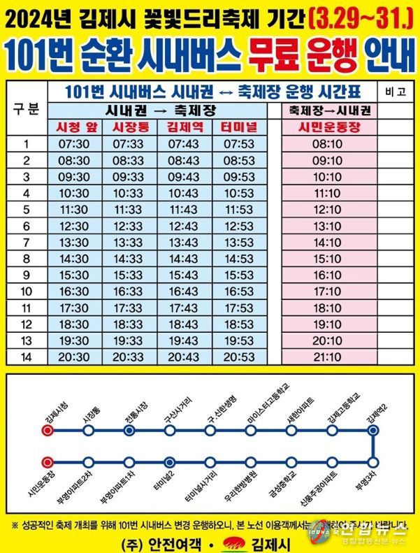 전국연합뉴스 최성용 기자 | 김제가 오는 29일부터 31일까지(3일간) 김제시민운동장에서 개최되는 꽃빛드리 축제에 101번 시내버스를 무료로 운행한다.