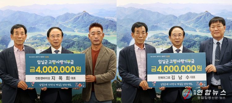 전국연합뉴스 최성용 기자 | 친환경바이오 지옥희 대표와 전북아그로 김남수 대표가 지난 26일 임실에 고향사랑기부금 각 4백만원씩, 총 8백만원을 기탁했다.