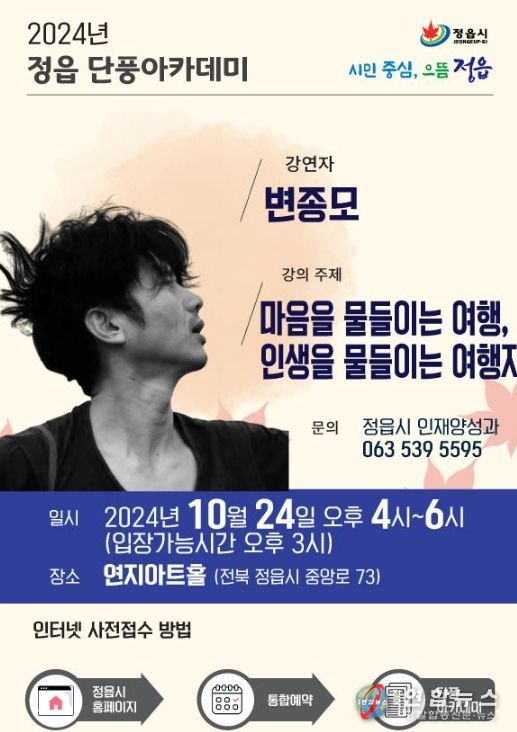 전국연합뉴스 최성용 기자 | 정읍시는 오는 24일 오후 4시, 연지아트홀에서 여행작가 변종모를 초청해 ‘마음을 움직이는 여행, 인생을 물들이는 여행지’라는 주제로 특별 강연을 개최한다.