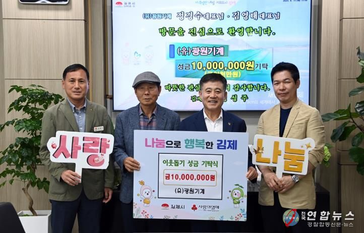 전국연합뉴스 최성용 기자 | 김제시는 (유)광원기계가 19일 지역 저소득 가정을 위해 사용해 달라며 1천만 원의 성금을 기탁했다고 밝혔다.