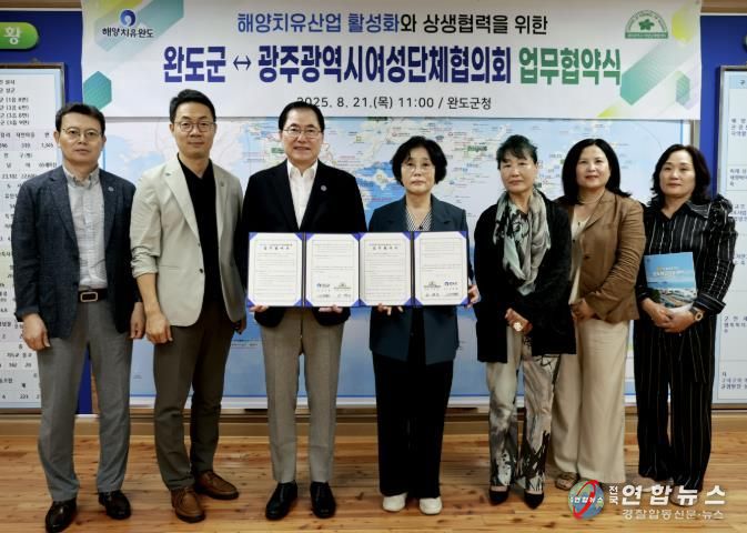 전국연합뉴스 김철환 기자 | 완도군이 광주여성단체협의회와 완도해양치유산업 활성화 및 광주여성단체협의회와의 상생을 위한 업무 협약을 체결했다.