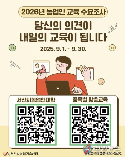 조사 항목은 ▲2026년 서산시농업인대학 ▲품목별 영농교육 2개 분야로 나뉘며 각 교육에 대한 농업인의 의견을 반영할 질문들로 구성됐다.
