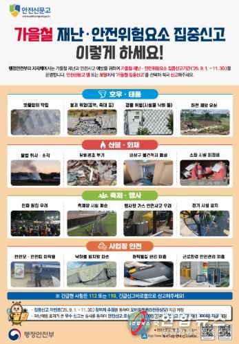 전국연합뉴스 김용태 기자 | 청양군은 가을철 재난과 안전사고 예방을 위해 지난 1일부터 오는 11월 30일까지 3개월간 ‘가을철 재난·안전 위험요소 집중신고기간’를 운영한다고 밝혔다.
