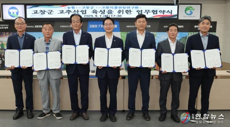 전국연합뉴스 최성용 기자 | 고창군이 지난 1일 오후 5곳의 지역농협(고창농협, 선운산농협, 대성농협, 해리농협, 흥덕농협), 고창식품산업연구원과 손잡고, 고추산업의 경쟁력 강화와 지속가능한 발전을 위한 업무협약을 체결했다.