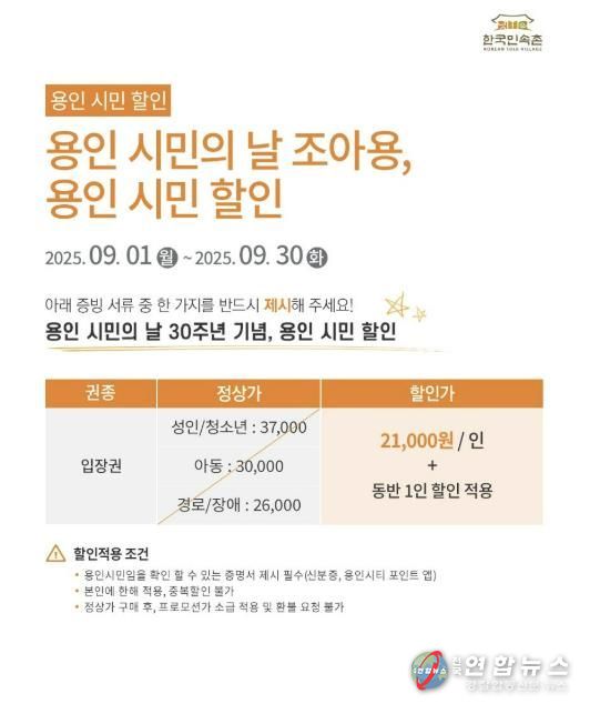 전국연합뉴스 박남호 기자 | 용인특례시는 ‘제30회 용인시민의 날’을 기념해 9월 한국민속촌과 용인투어패스를 할인 제공하는 특별 행사를 진행한다고 8일 밝혔다.