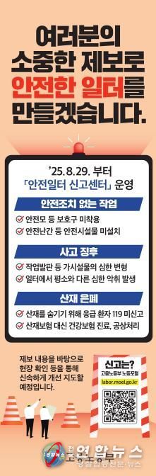 군 관계자는 “안전일터 신고센터 운영은 군민이 참여하는 안전문화 확산의 핵심 수단”이라며 “작은 신고 하나가 군민과 가족의 안전을 지킬 수 있다”고 설명했다. 이어 “청양군은 앞으로도 산업현장의 안전 관리 체계를 강화하고, 군민이 안심하고 일할 수 있는 환경을 조성하기 위해 다각적으로 노력하겠다”고 밝혔다.