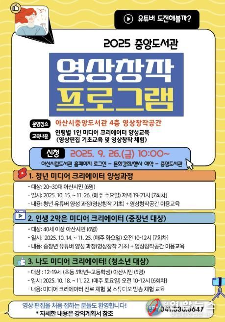 고영이 아산시립도서관장은 “이번 과정을 통해 시민들이 영상 창작을 쉽게 접하고 자신만의 이야기를 영상으로 표현하는 즐거움을 경험하길 바란다”고 말했다.