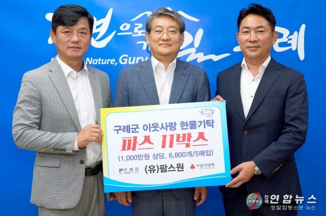 전국연합뉴스 김철환 기자 | 전남 구례군은 지난 29일 (유)팜스원에서 파스 11박스(6,800개/5매, 1,000만 원 상당)를 기탁했다고 밝혔다.