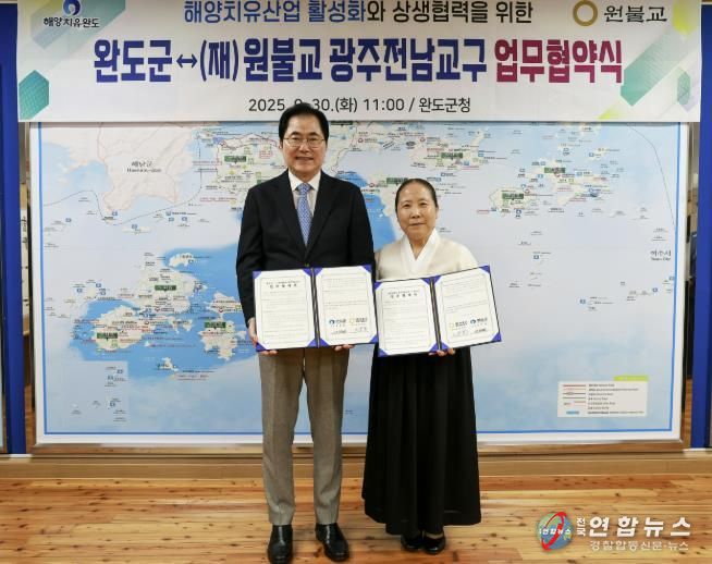 전국연합뉴스 김철환 기자 | 완도군이 완도 해양치유산업 활성화를 위해 (재)원불교 광주전남교구와 업무 협약을 체결했다.
