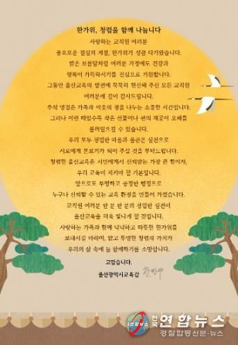 전국연합뉴스 기자 | 울산광역시교육청은 추석을 앞두고 1일 울산 지역 전 교육기관과 학교 교직원들에게 청렴 의지를 다지는‘청렴 서한문’을 보냈다.