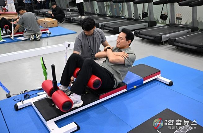 전국연합뉴스 김태연 기자 | 오세훈 서울시장이 10월 1일 오후 서울시청 체력단련실에서 지난 9월 10일 발표한 '건강도시 서울 종합계획-더 건강한 서울 9988'의 주요 사업인 ‘체력인증센터’ 운영을 앞두고 체력측정 장비를 점검하고 시범 측정을 진행했다.