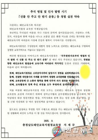 전국연합뉴스 기자 | 충청남도태안교육지원청은 추석 연휴 시기를 맞아 청렴한 공직문화를 확산하기 위해 ‘선물 안 주고 안 받기 운동’을 강조하는 청렴 서한문을 홈페이지에 게시했다.