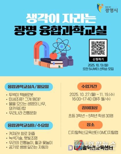 전국연합뉴스 조민준 기자 | 광명시는 오는 10월 27일부터 11월 19일까지 초등학교 3~5학년을 대상으로 ‘생각이 자라는 광명 융합과학교실’ 시범수업을 운영한다.